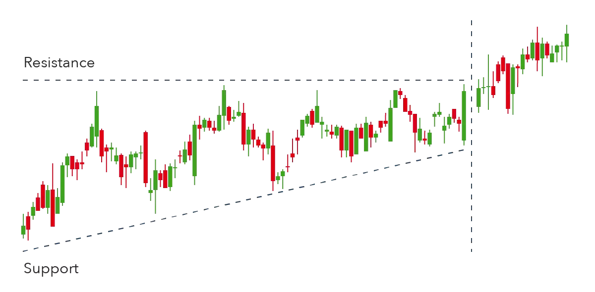 A falling wedge occurs between two downwardly sloping levels. In this case the line of resistance is steeper than the support. A falling wedge is usually indicative that an asset’s price will rise and break through the level of resistance, as shown in the example below.