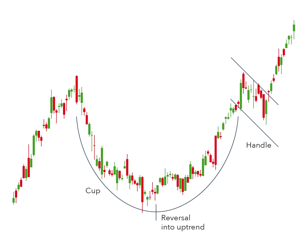 The cup and handle pattern is a bullish continuation pattern that is used to show a period of bearish market sentiment before the overall trend finally continues in a bullish motion. The cup appears similar to a rounding bottom chart pattern, and the handle is similar to a wedge pattern – which is explained in the next section.