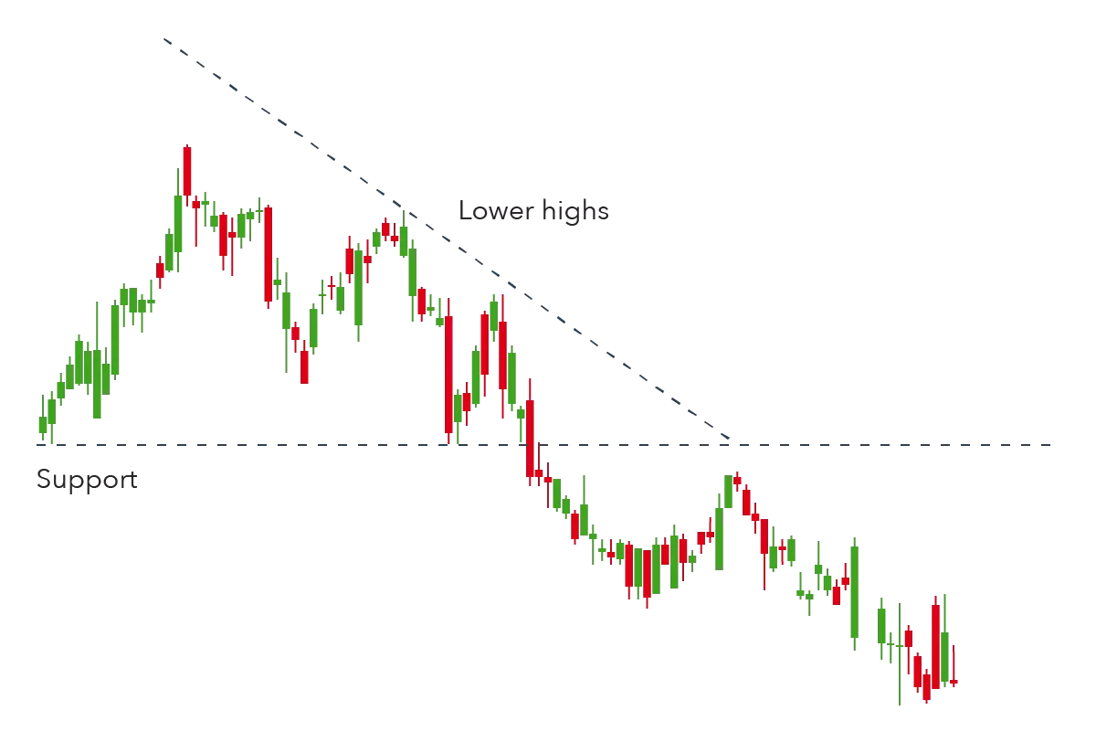 In contrast, a descending triangle signifies a bearish continuation of a downtrend. Typically, a trader will enter a short position during a descending triangle – possibly with CFDs – in an attempt to profit from a falling market.