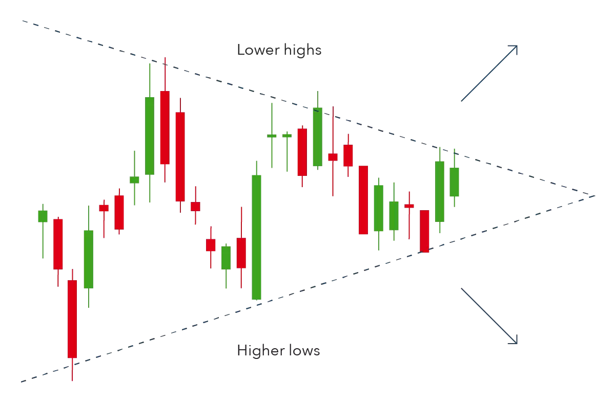 Symmetrical triangles form when the price converges with a series of lower peaks and higher troughs. In the example below, the overall trend is bearish, but the symmetrical triangle shows us that there has been a brief period of upward reversals.